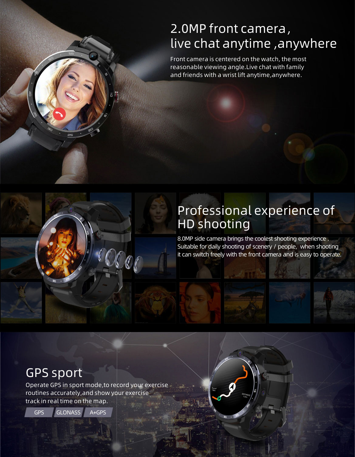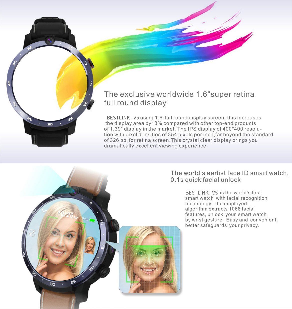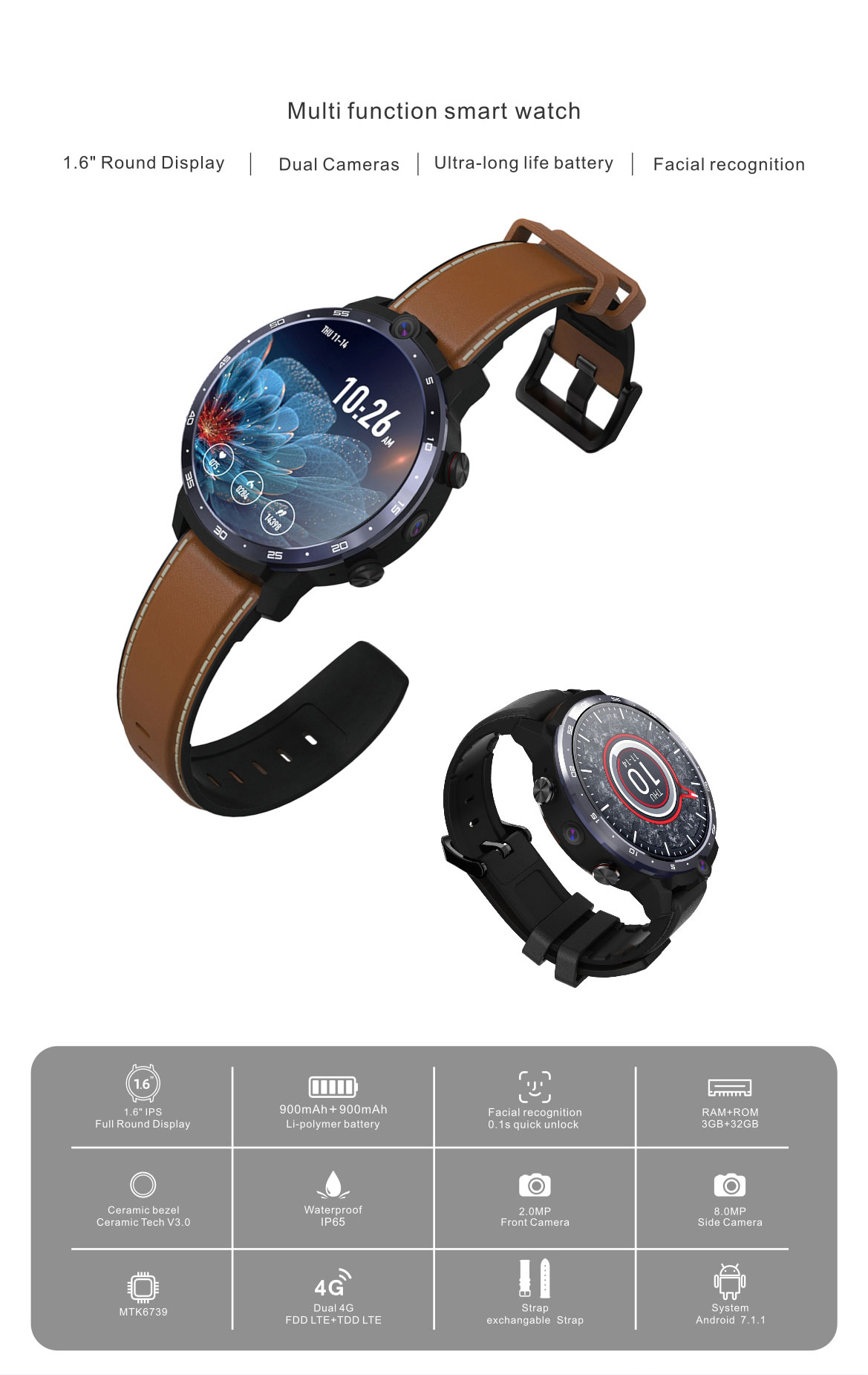CPU:MTK6739 Watch OS: ANDROID / iOS Flash: Max Support 32G RAM: 3G Display: 1.6 inch Round Display Resolution: 400*400 pixel Camera: 500W pixel Battery: polymer 900mAh Standy time: 15 days Touch control: Fully Touch Bluetooth: Bluetooth4.2, BLE Side button: Power & function button Housing material: Anodized alumina metal WiFi: Support NFC: Support GPS: Support SIM Card: Support Bluetooth audio: support G-sensor: 6 Axis G-sensor Optical heart rate sensor: support Multi sport mode: support Dimension: 50mm Language: multi Language Music: support Video: suppot E-book:support Face recognition:support Inquire Now