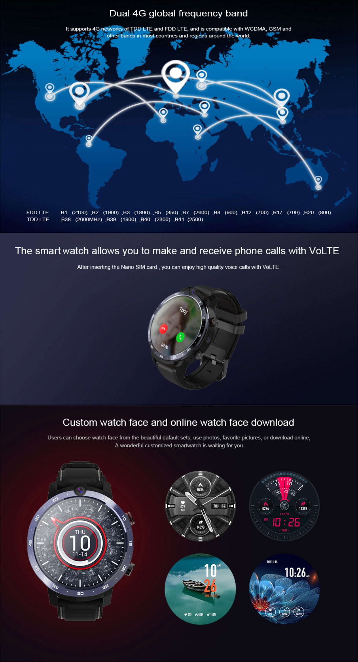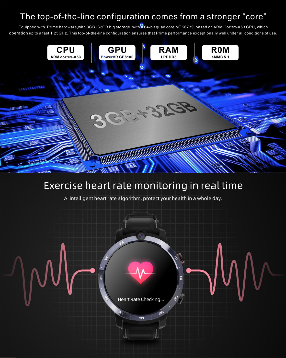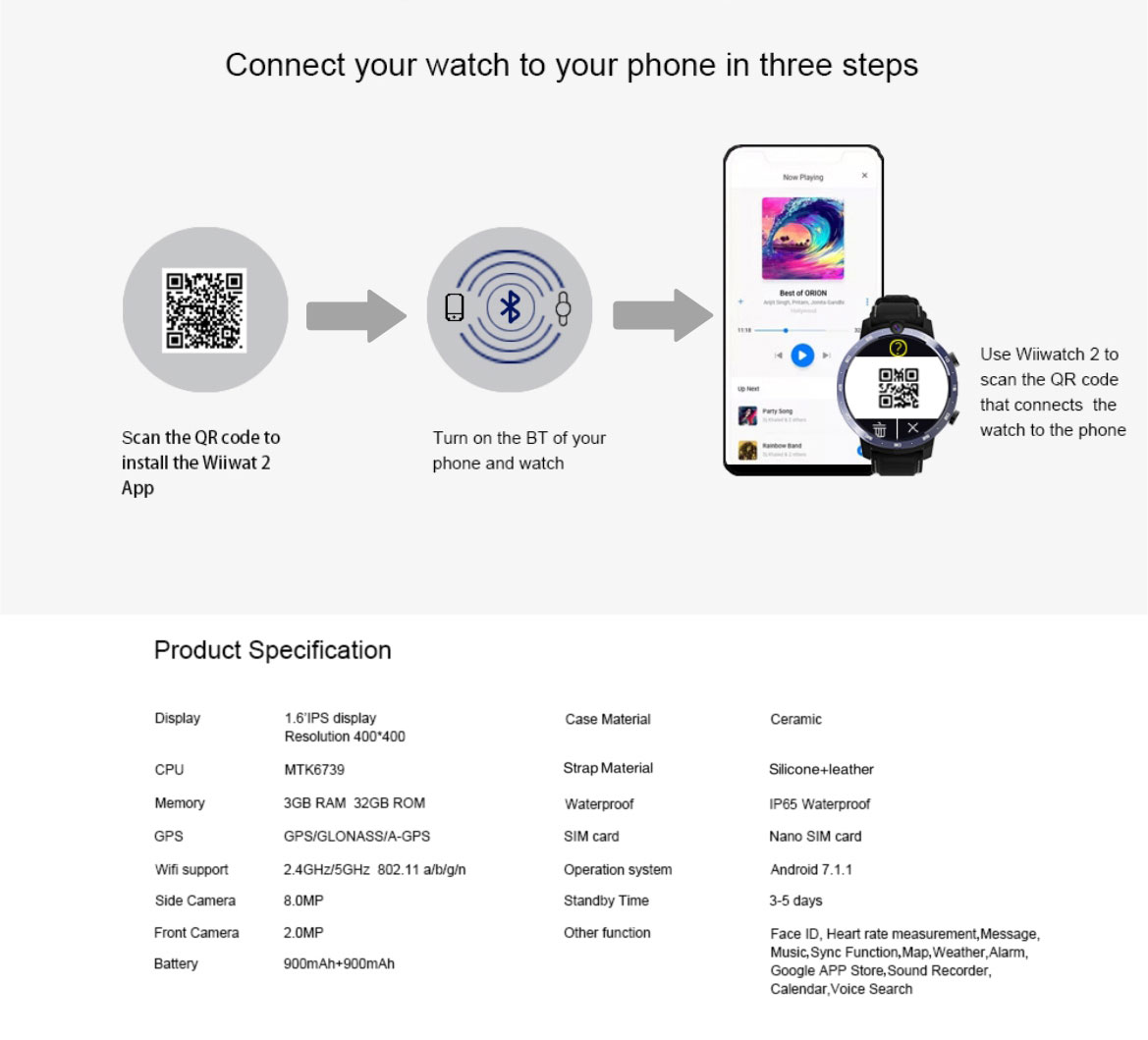 CPU:MTK6739 Watch OS: ANDROID / iOS Flash: Max Support 32G RAM: 3G Display: 1.6 inch Round Display Resolution: 400*400 pixel Camera: 500W pixel Battery: polymer 900mAh Standy time: 15 days Touch control: Fully Touch Bluetooth: Bluetooth4.2, BLE Side button: Power & function button Housing material: Anodized alumina metal WiFi: Support NFC: Support GPS: Support SIM Card: Support Bluetooth audio: support G-sensor: 6 Axis G-sensor Optical heart rate sensor: support Multi sport mode: support Dimension: 50mm Language: multi Language Music: support Video: suppot E-book:support Face recognition:support Inquire Now
